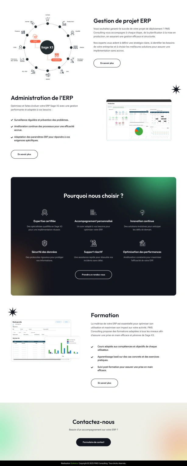 Chaque section guide le visiteur vers des solutions concrètes : accompagnement ERP, formation, support et optimisation des outils Sage X3.